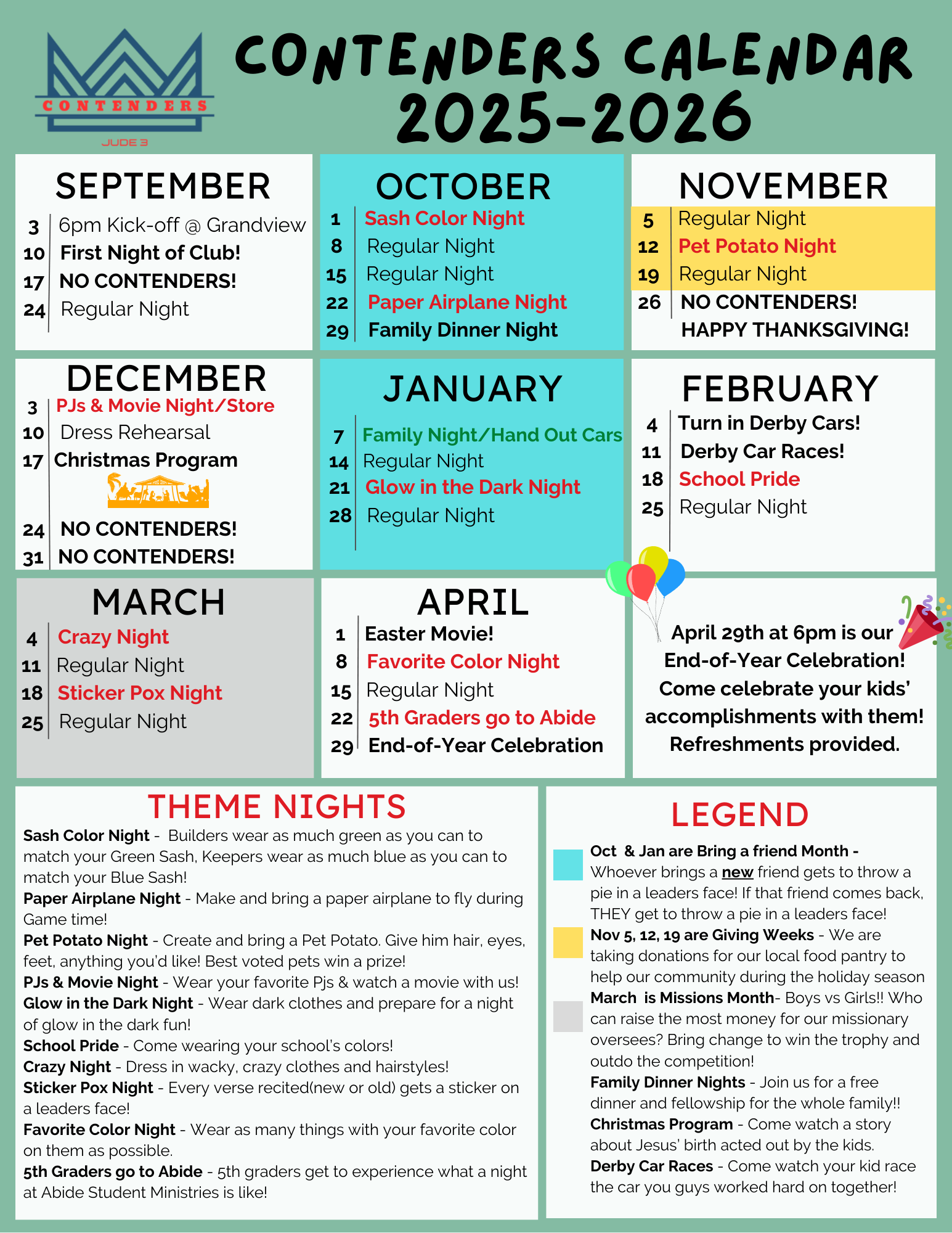 We are very excited about this year and can’t wait to see how much your kids learn and grow! Young people hold a special place in Jesus’ heart. He created them. He sacrificed His life for their sins. He longs for them to know, love, and serve Him. He desires to spend eternity with them. His kingdom belongs to such as these. That’s why kids matter so deeply to us at Grandview. Our goal at Contenders is to lead and train every kid to CONTEND for their faith. In order for anyone to ‘contend for’ or ‘stand up for’ their faith, they need to know WHO God is and the truths spelled out in the Bible. We strive to communicate these truths as best we can to each and every child, pointing them toward a lifetime of obeying scripture.