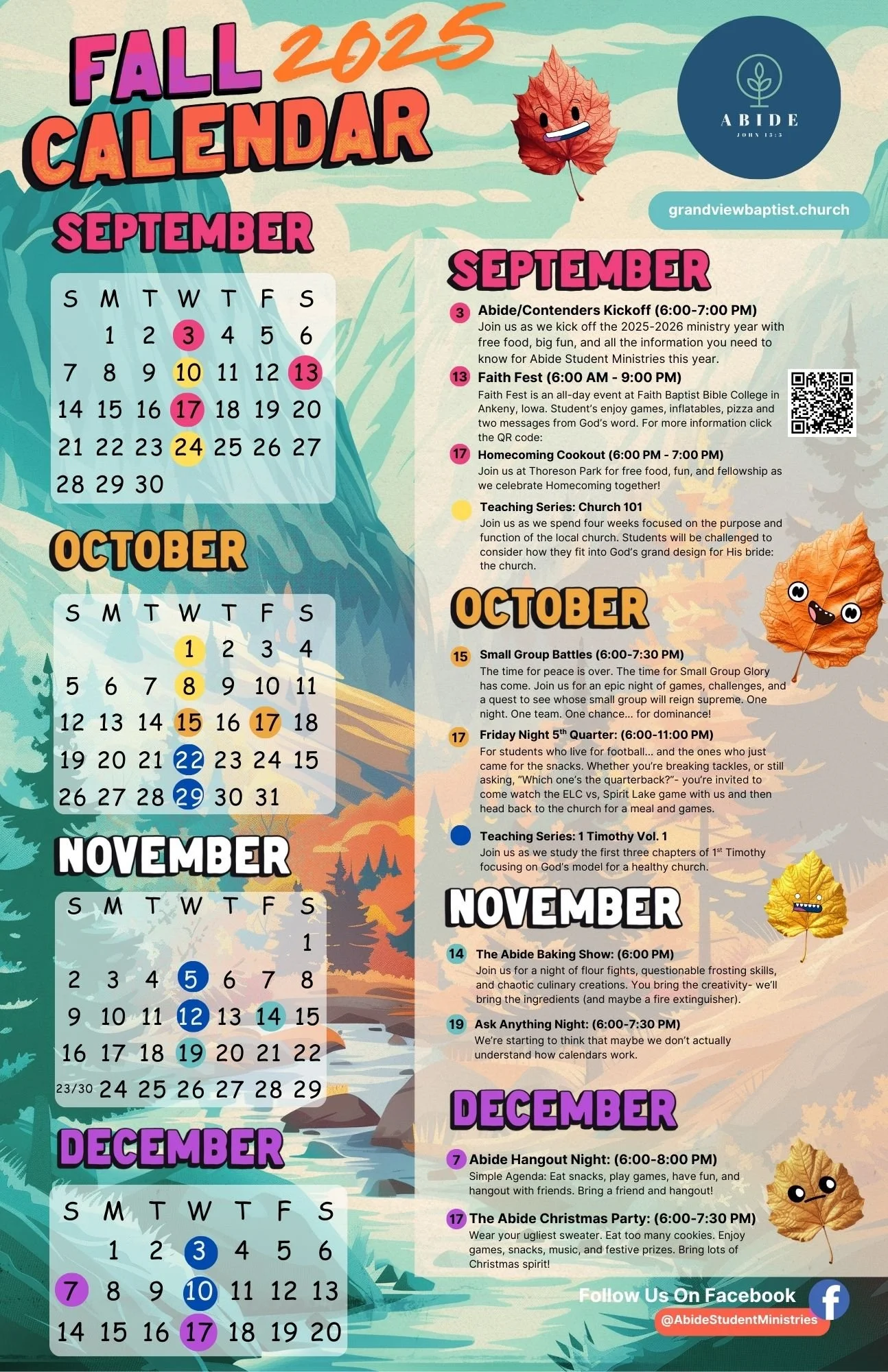 Abide Student Ministries is for students grades 6th-12th at Grandview Baptist Church. Abide exists to help students abide in Christ through Biblical Teaching, Creative Discipleship, and Partnership with Parents. During the school year times are split between Jr. and Sr. High with Jr. High meeting from 6:00-7:30 and Sr. High meeting from 7:00-8:30. Below you will find and overview of our events and Wednesday Night meetings for the Fall.